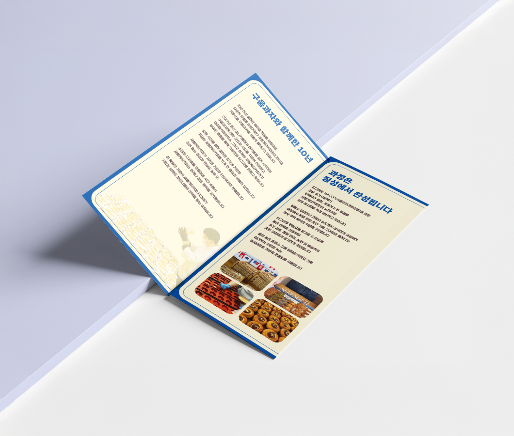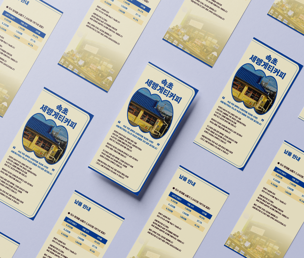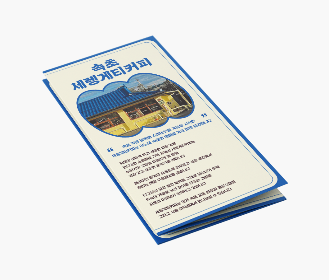 속초 세렝게티 커피_리플렛 브랜드의 따뜻한 이미지를 강조하기 위해 블루 포인트 컬러와 직관적인 레이아웃을 적용하였습니다. 사진과 텍스트를 균형 있게 배치하여 신뢰성과 정보 전달력을 높였으며, 편안하고 친근한 분위기를 시각적으로 표현하였습니다.