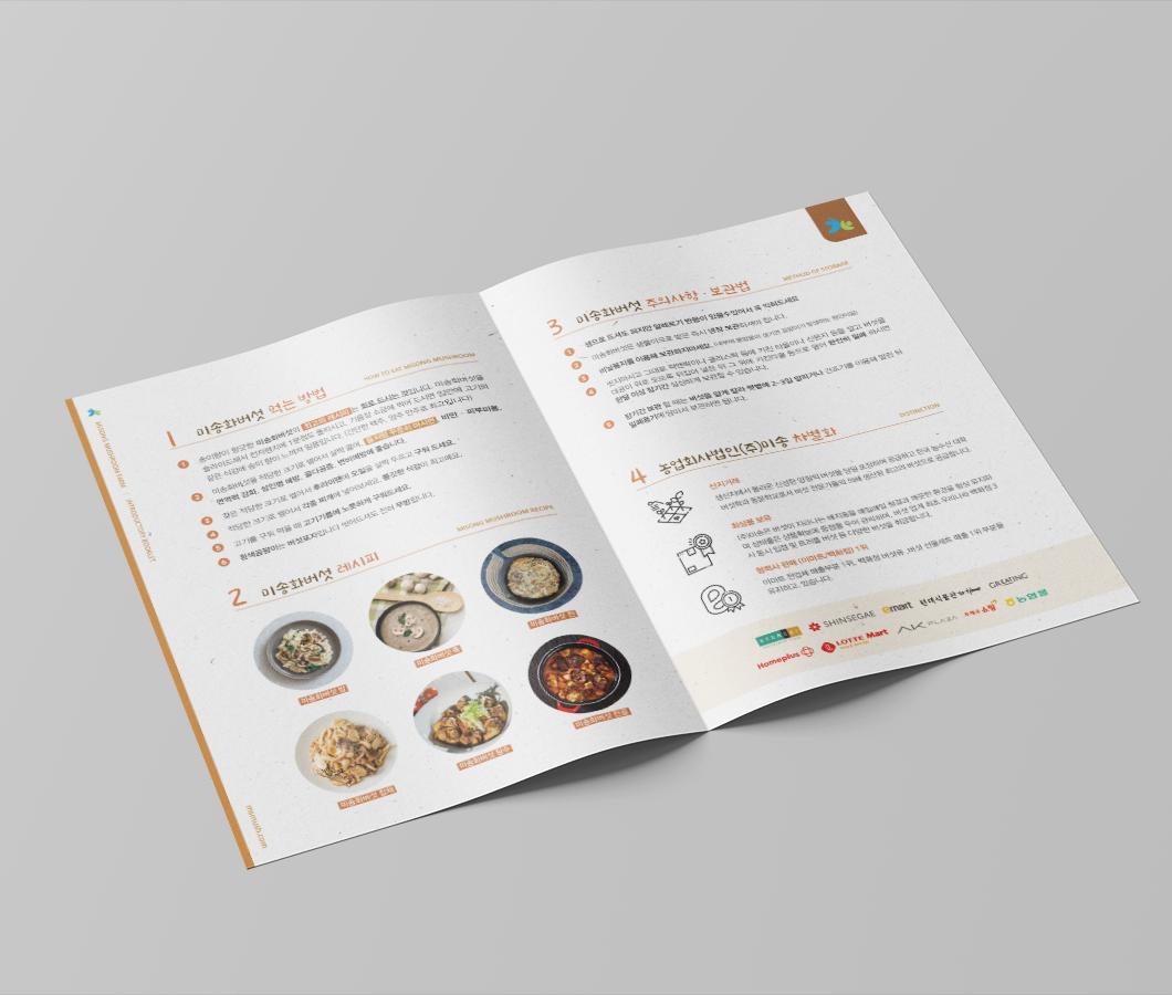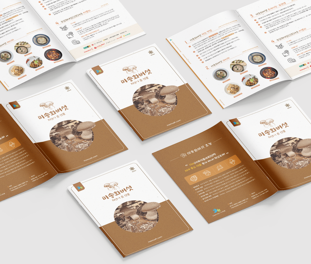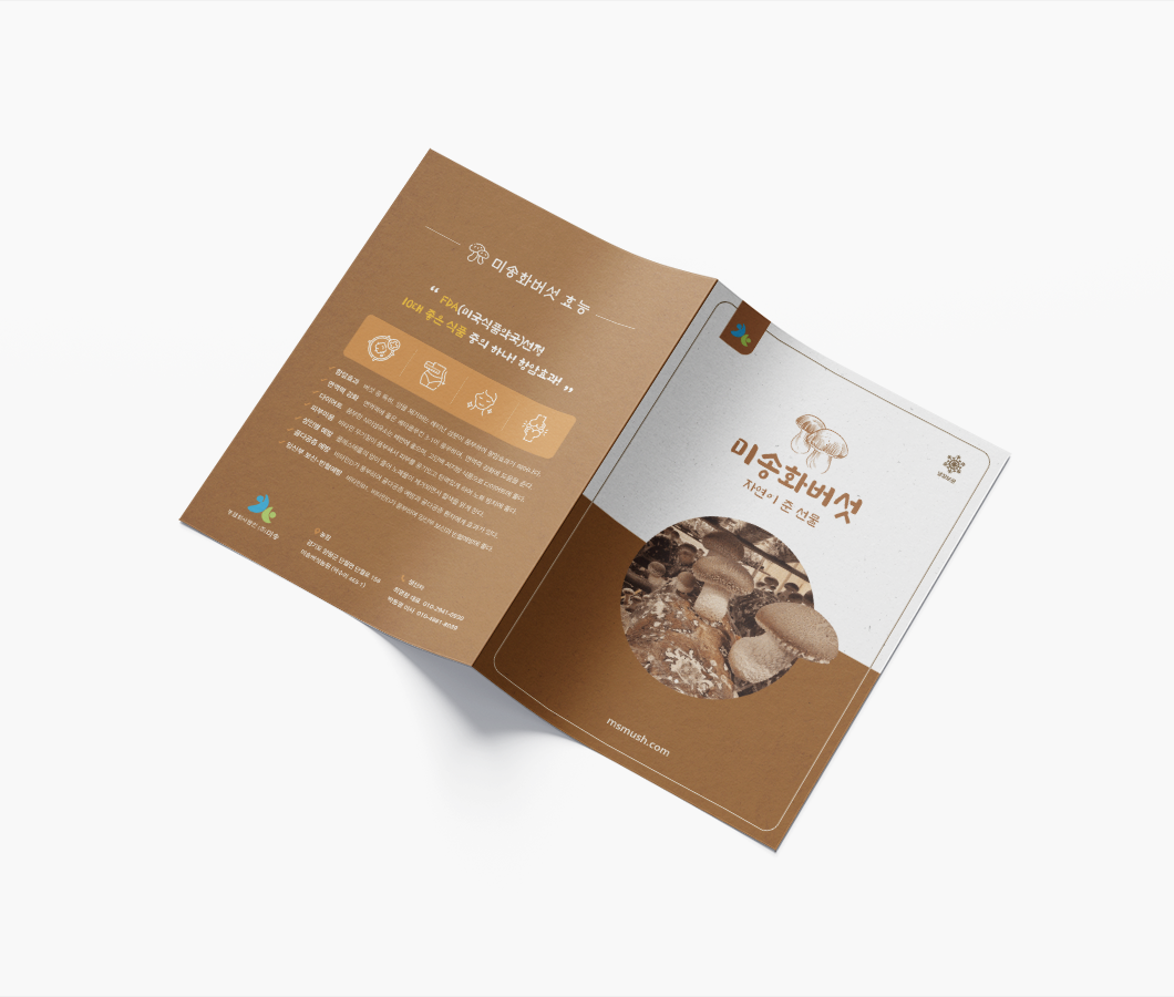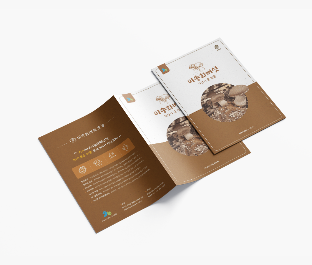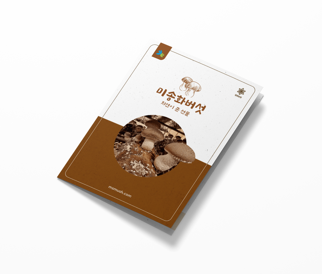 미송화버섯_카탈로그 전체적으로 브라운 계열과 한지 질감을 사용하여 자연스럽고 따뜻한 느낌입니다. 전반적으로 실용적이고 정보 전달이 명확하며, 브랜드의 친근하고 자연스러운 이미지를 잘 표현한 카탈로그입니다.
