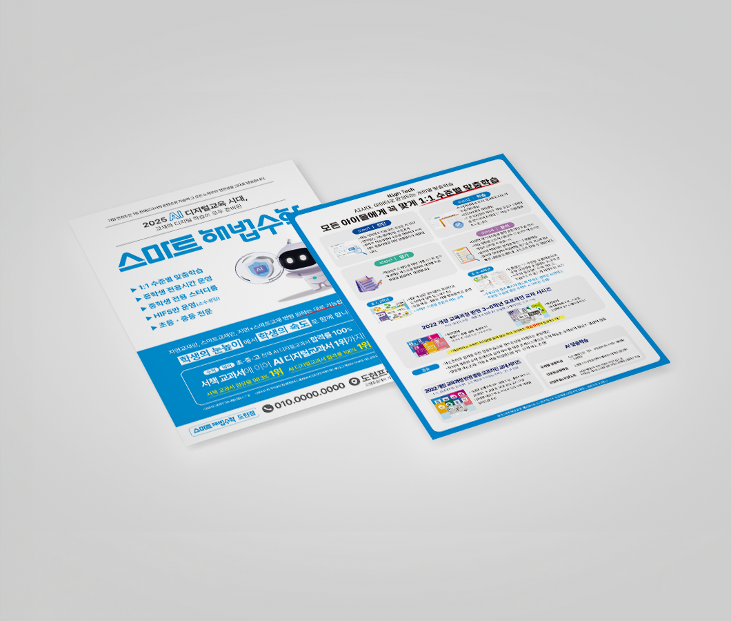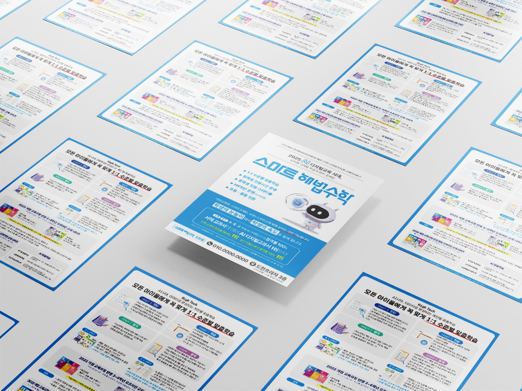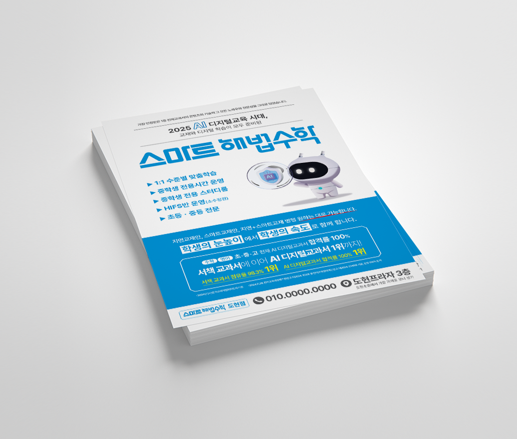 스마트해법수학_전단지 AI 디지털 교육 시대를 강조하는 학원 홍보 전단지 디자인으로, 신뢰감과 전문성을 전달하기 위해 블루 계열을 메인 컬러로 사용하였으며, 심플한 레이아웃 속에서 핵심 메시지가 빠르게 눈에 들어오도록 구성하였습니다.