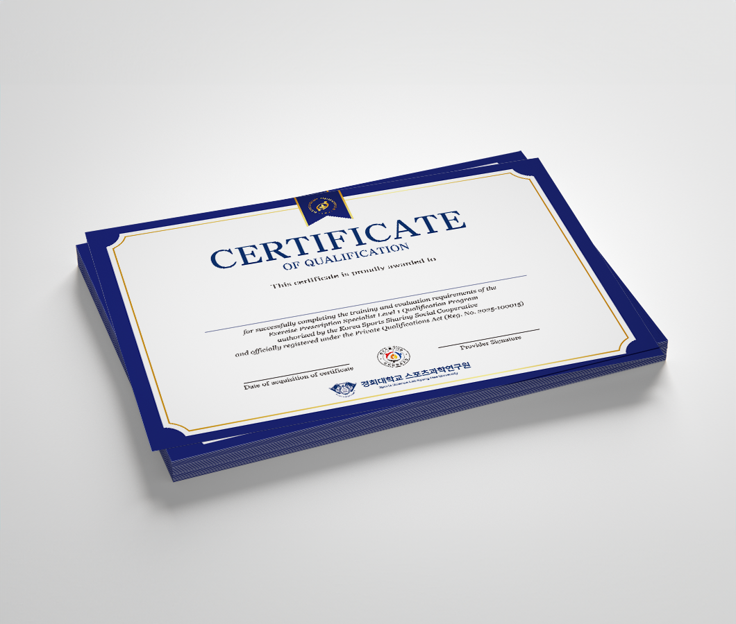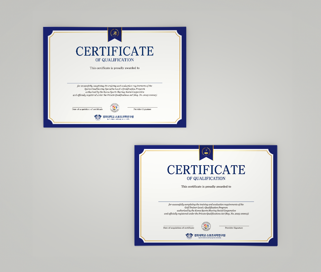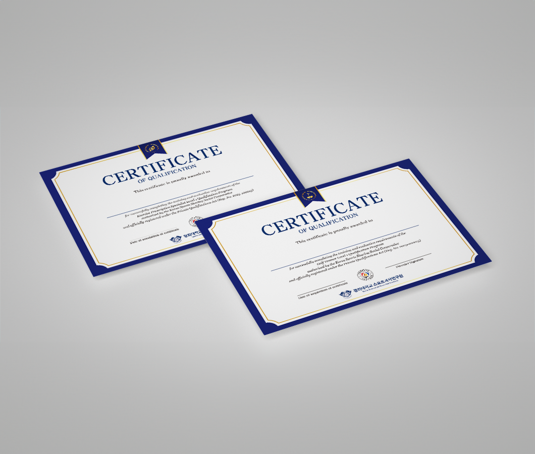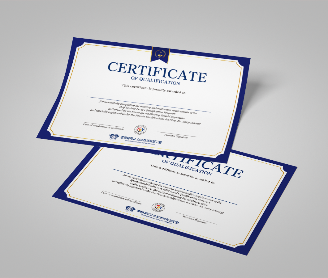 한국스포츠나눔 사회적협동조합_자격증 공신력과 전문성을 강조하기 위해 딥블루와 골드 포인트를 사용하여 신뢰감과 품격을 전달하였습니다. 심플하면서도 단정한 레이아웃으로 자격의 가치와 성취를 돋보이게 디자인하였습니다.