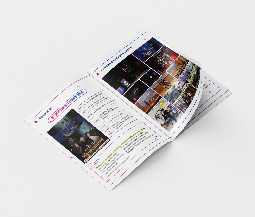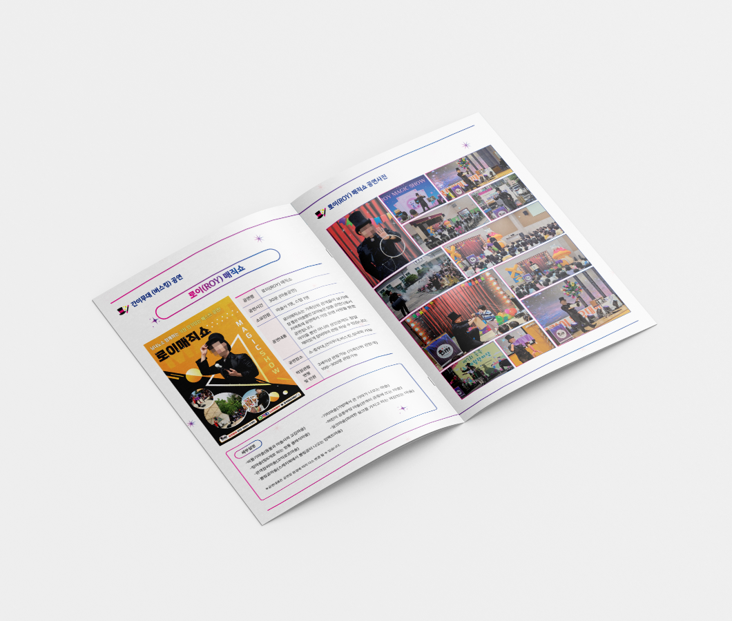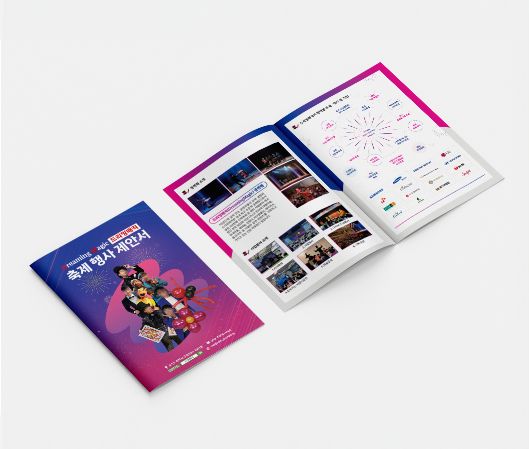 드리밍매직_카탈로그 화려한 그래픽과 생동감 있는 컬러를 활용해 즐거운 분위기를 표현한 제안서입니다. 공연 소개, 이미지 갤러리, 협력사 로고 등을 시각적으로 정리해 정보 전달력과 시각적 완성도를 높인 디자인입니다.
