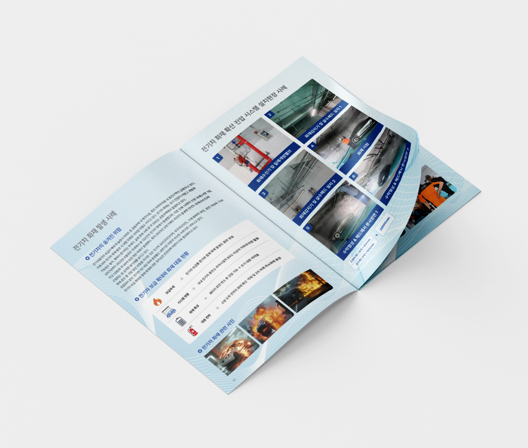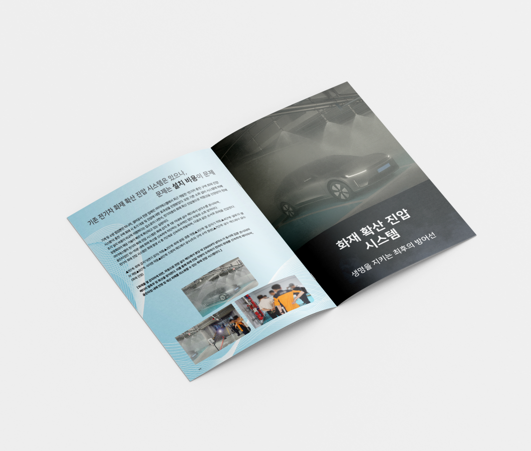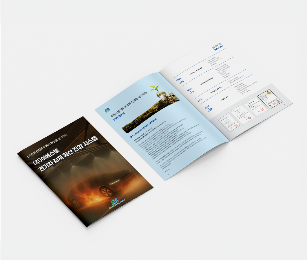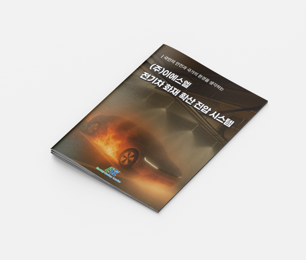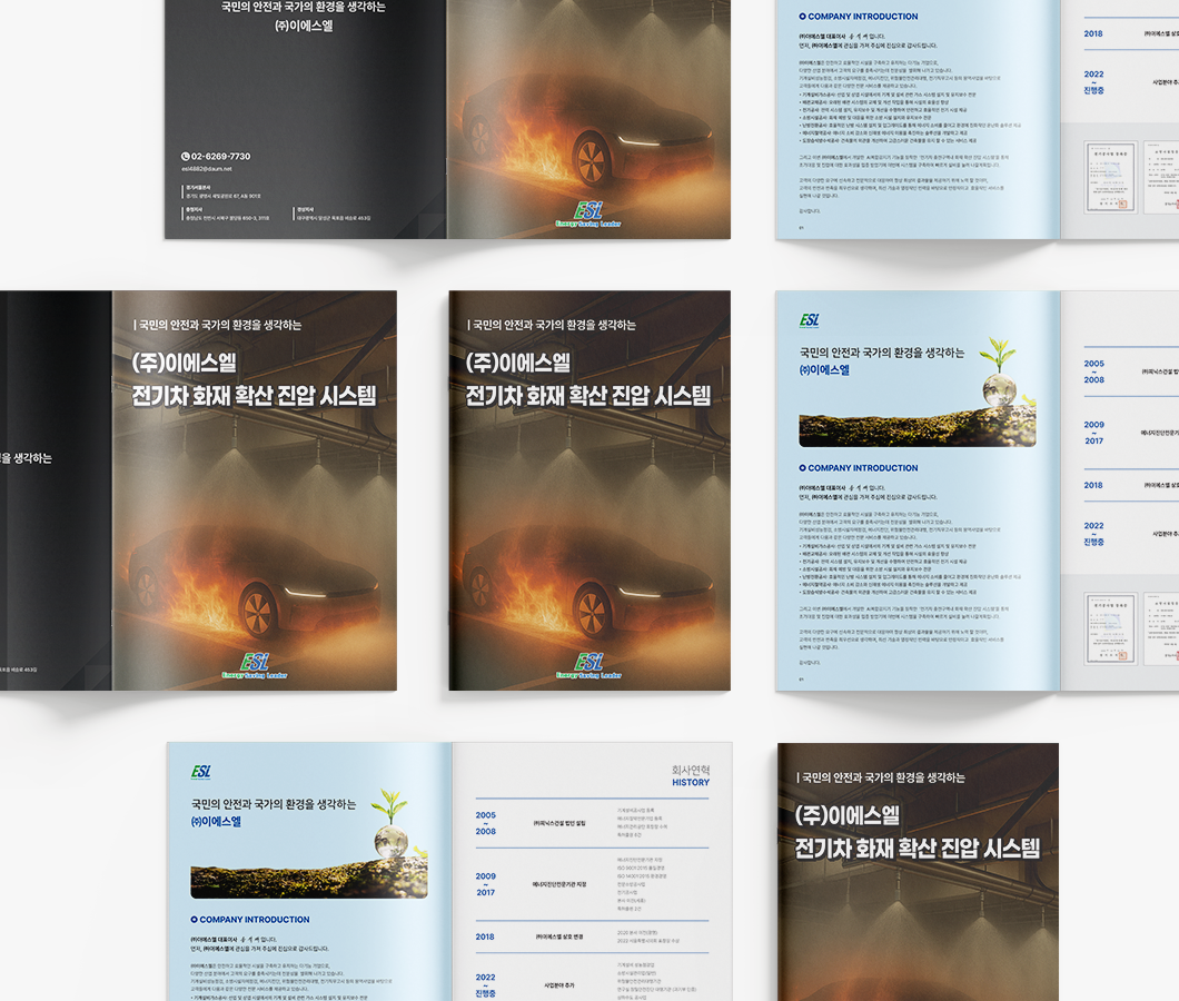이에스엘_카탈로그 짙은 톤의 표지와 불길 속 차량 이미지를 통해 위험 대응 솔루션의 강력한 메시지를 전달하고, 내부는 밝은 블루 톤을 사용해 안전성과 신뢰감을 표현하였습니다.