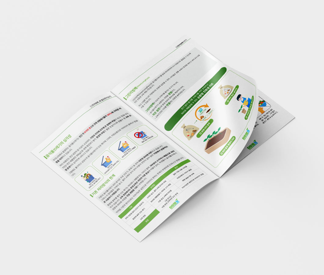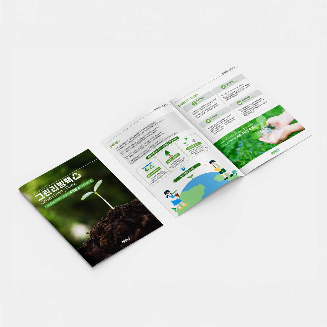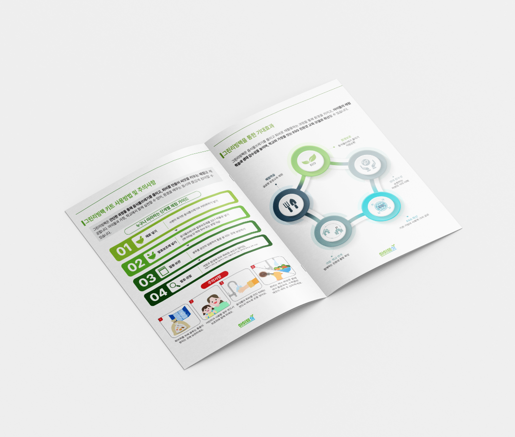 아이템싯_카탈로그 그린 컬러를 중심으로 한 깔끔한 레이아웃으로 친환경 브랜드 이미지를 직관적으로 표현한 디자인입니다. 실사 이미지와 아이콘을 활용해 정보를 간결하게 전달하고, 전체적으로 가독성과 정돈감을 높였습니다.