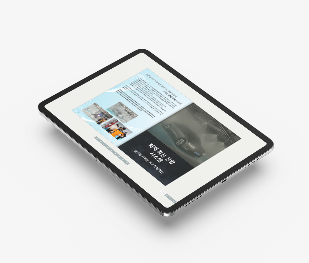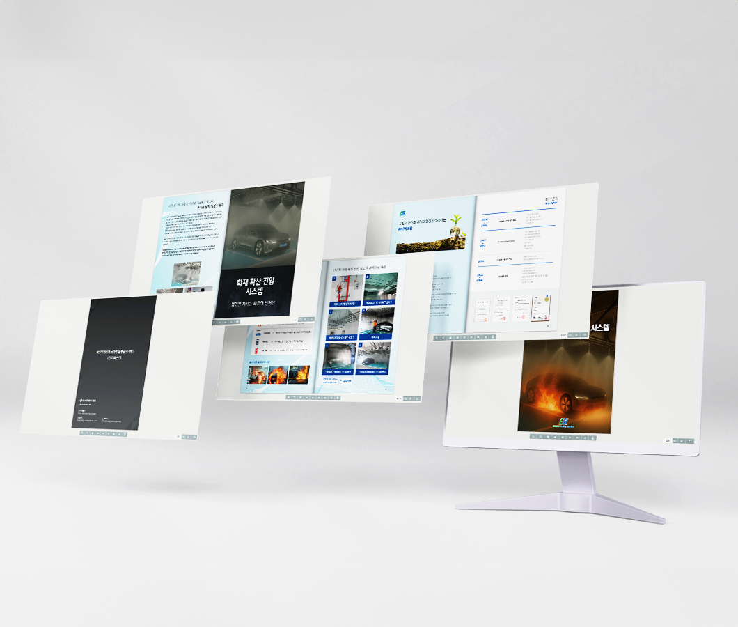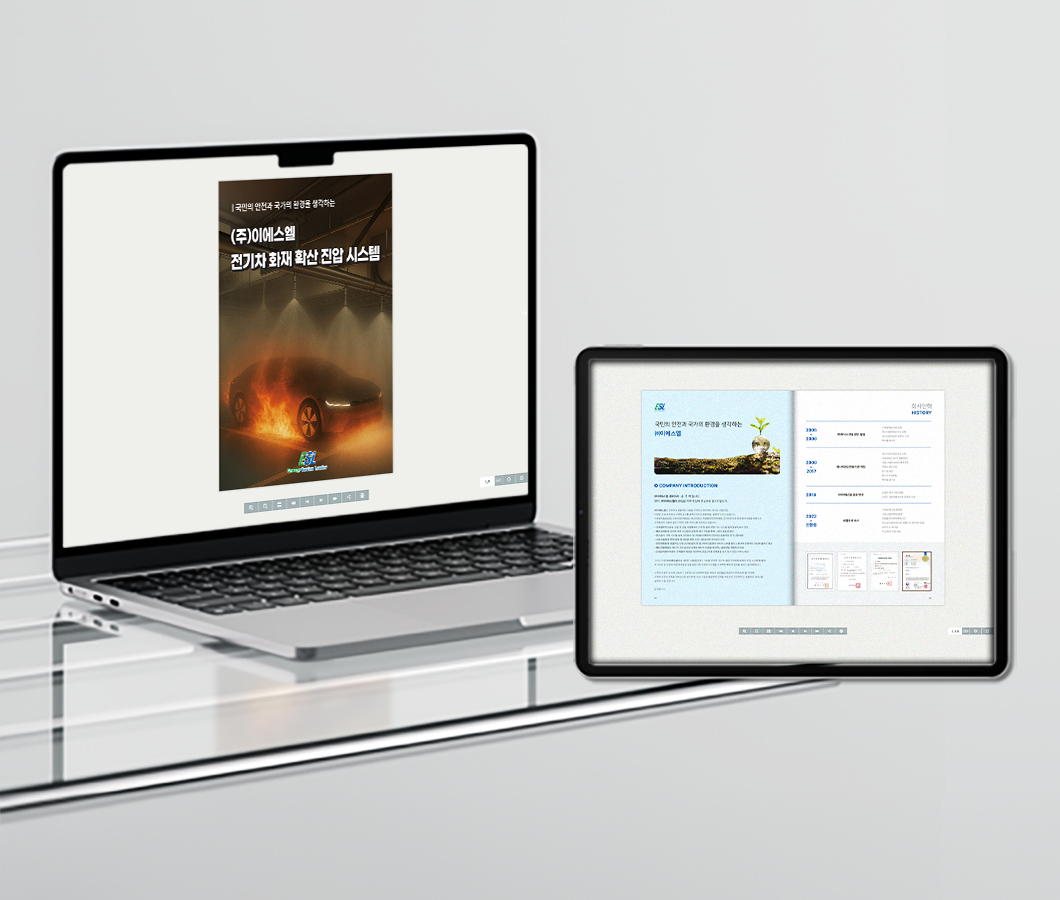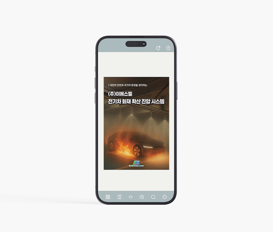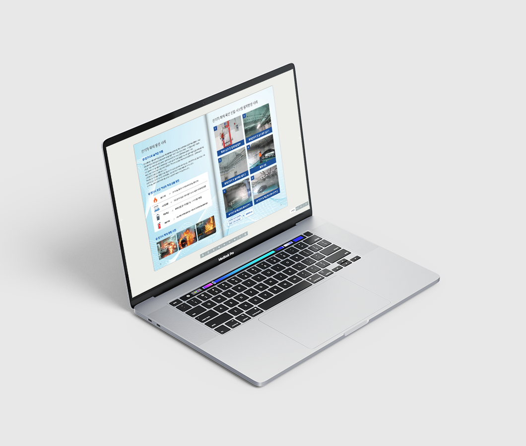 이에스엘_전자책 짙은 톤의 표지와 불길 속 차량 이미지를 통해 위험 대응 솔루션의 강력한 메시지를 전달하고, 내부는 밝은 블루 톤을 사용해 안전성과 신뢰감을 표현하였습니다.